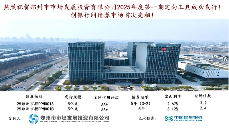 近日,鄭州市市場發(fā)展投資有限公司(以下簡稱“鄭州市投”,外部主體評級AA+)成功發(fā)行2025年度第一期定向債務(wù)融資工具,進一步優(yōu)化了公司融資結(jié)構(gòu)。本期債券由民生銀行擔任主承銷商,發(fā)行總規(guī)模10億元,創(chuàng)新采用“3+2年”(票面利率2.67%)與“5年”(票面利率3.12%)雙期限結(jié)構(gòu),創(chuàng)下近期同期限、同評級企業(yè)信用債首發(fā)利率較低水平,顯示出資本市場對鄭州國企發(fā)展前景的高度認可。
